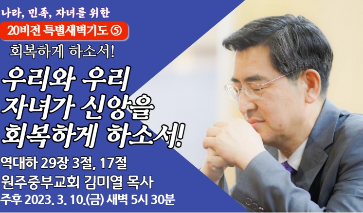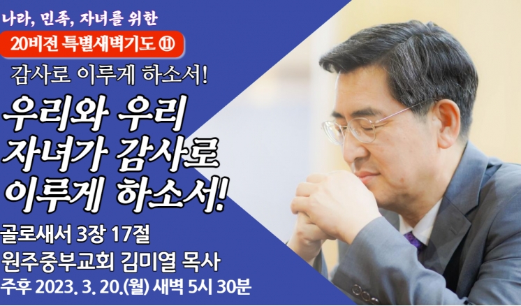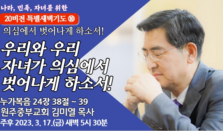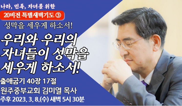 예배/말씀 - 주일예배 - 수요예배 - 특별예배 - QT 매일만나 - 특별새벽기도 - 말씀과기도축제 - 초빙강사 - CTS - 오디오설교(MP3) - 이전설교(18-21) 전체 20비전 고난주간 송구영신 분류 20비전 고난주간 송구영신 우리와 우리 자녀가 부름으로 이루게 하소서! 20비전 2023,03,23 우리와 우리 자녀가 소망으로 이루게 하소서! 20비전 2023,03,22 우리와 우리 자녀가 순종으로 이루게 하소서! 20비전 2023,03,21 우리와 우리 자녀가 감사로 이루게 하소서! 20비전 2023,03,20 우리와 우리 자녀가 의심에서 벗어나게 하소서! 20비전 2023,03,17 우리와 우리 자녀가 감동하는 사람이 되게 하소서! 20비전 2023,03,16 우리와 우리 자녀가 쓰임받는 사람되게 하소서! 20비전 2023,03,15 우리와 우리 자녀가 힘있게 하소서! 20비전 2023,03,14 우리와 우리 자녀가 크게 하여 주소서! 20비전 2023,03,13 우리와 우리 자녀가 신앙을 회복하게 하소서! 20비전 2023,03,10 우리와 우리 자녀가 바벨론을 떠나게 하소서! 20비전 2023,03,09 우리와 우리의 자녀들이 성막을 세우게 하소서! 20비전 2023,03,08 목록 제목+내용제목내용댓글이름닉네임아이디등록일태그 3 4 5 6 7 8 9 10 11 12 예배/말씀 주일예배 수요예배 특별예배 QT 매일만나 특별새벽기도 말씀과기도축제 초빙강사 CTS 오디오설교(MP3) 이전설교(18-21)