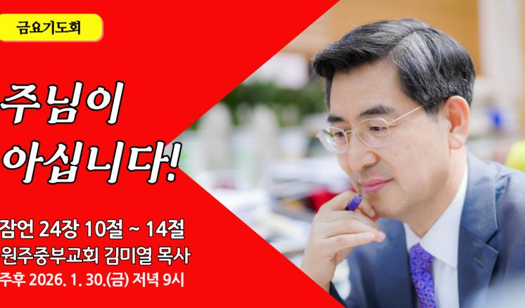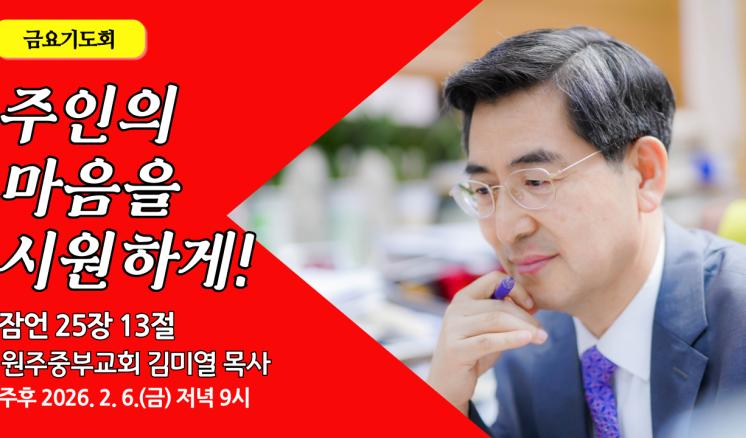 예배/말씀 - 주일예배 - 수요예배 - 특별예배 - QT 매일만나 - 특별새벽기도 - 말씀과기도축제 - 초빙강사 - CTS - 오디오설교(MP3) - 이전설교(18-21) 주인의 마음을 시원하게! 2026,02,06 주님이 아십니다! 2026,02,01 자녀로서! 부모로서! 2026,01,23 성도로서 할일에 충성하라! 2026,01,16 성경적 세계관 2026,01,09 마음을 아시는 주님 앞에서! 2026,01,02 더욱 귀한 보배 2025,12,26 성탄하신 한 아기의 축복 2025,12,25 오직 여호와의 뜻만이 2025,12,12 먼저 사연을 들어야 합니다 2025,12,05 화목의 복 2025,11,21 삼가의 말씀에 주의 하라! 2025,11,21 목록 제목+내용제목내용댓글이름닉네임아이디등록일태그 1 2 3 4 5 예배/말씀 주일예배 수요예배 특별예배 QT 매일만나 특별새벽기도 말씀과기도축제 초빙강사 CTS 오디오설교(MP3) 이전설교(18-21)